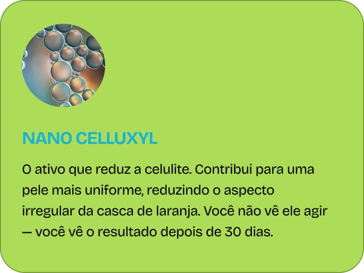 A fórmula tem 4 nanopartículas, cada uma com uma função específica. Por serem nanos, agem com muito mais eficácia do que ativos comuns, liberando os componentes gradualmente para afinar, tratar a celulite e firmar.