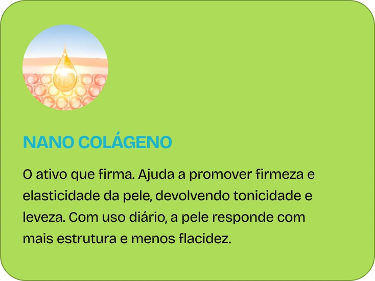 Cada ativo tem uma função específica. Juntos, eles criam a única fórmula do Brasil que afina, firma, reduz a celulite e uniformiza a pele, tudo em uma única aplicação diária. E você sente cada um deles agindo desde a primeira vez que passa.