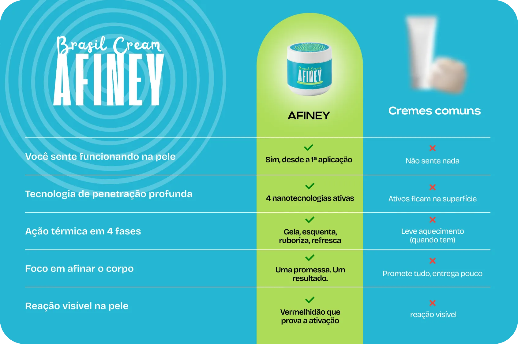AFINEY é o único creme modelador do Brasil com 4 nanotecnologias ativas. Ao aplicar, você sente gelar, aquecer e a ação afinadora desde o primeiro uso.