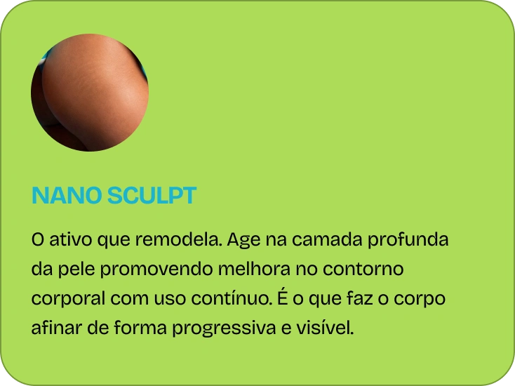 A fórmula tem 4 nanopartículas, cada uma com uma função específica. Por serem nanos, agem com muito mais eficácia do que ativos comuns, liberando os componentes gradualmente para afinar, tratar a celulite e firmar.